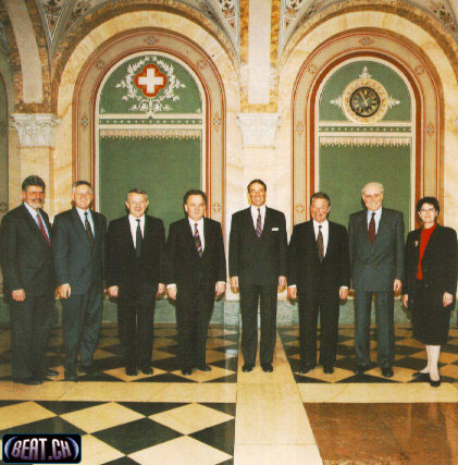 Von rechts die Bundesräte Moritz Leuenberger, Kaspar Villiger, Flavio Cotti, Jean-Pascal Delamuraz (Bundespräsident), Arnold Koller (Vizepräsident), Adolf Ogi und Bundesrätin Ruth Dreifuss sowie Bundeskanzler François Couchepin